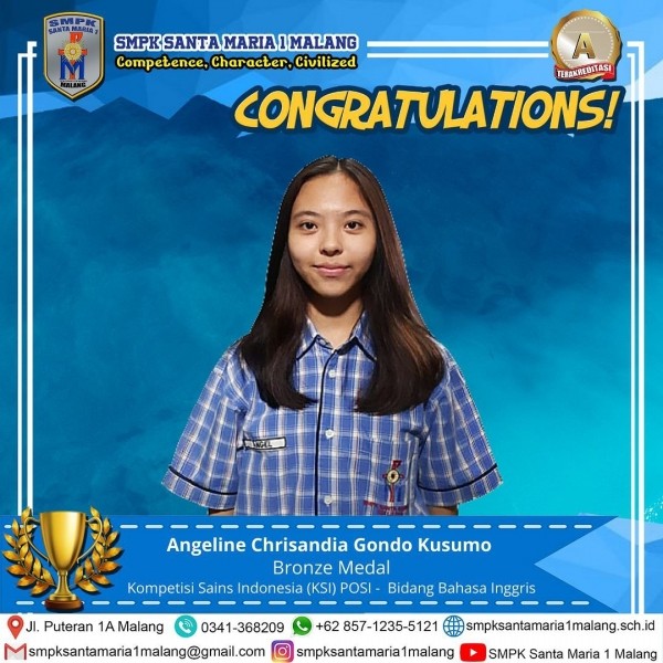 Proficiat untuk sahabat kita, Angel, yang mendapatkan bronze medal di Kompetisi Sains Indonesia dalam bidang Bahasa inggris.